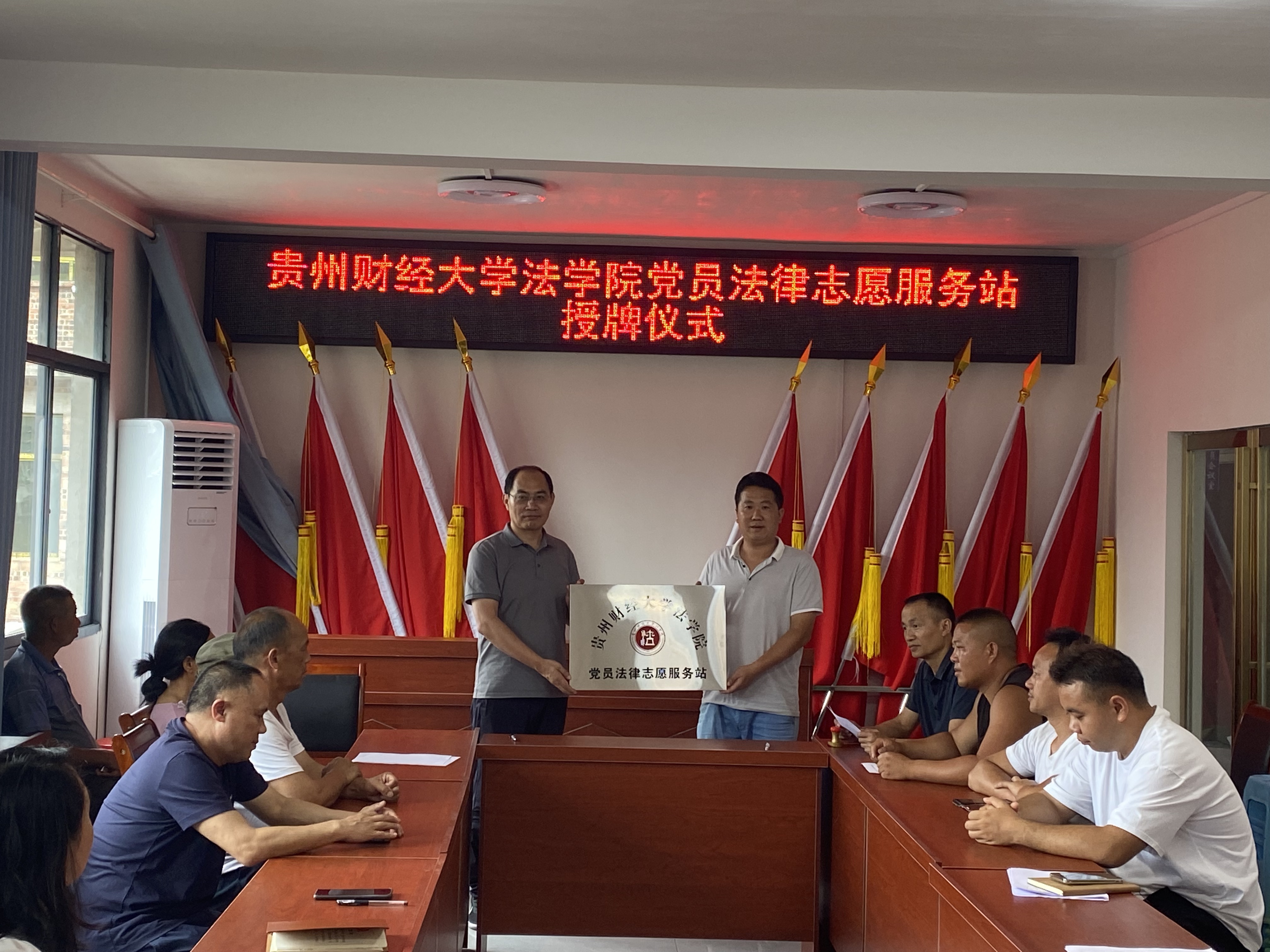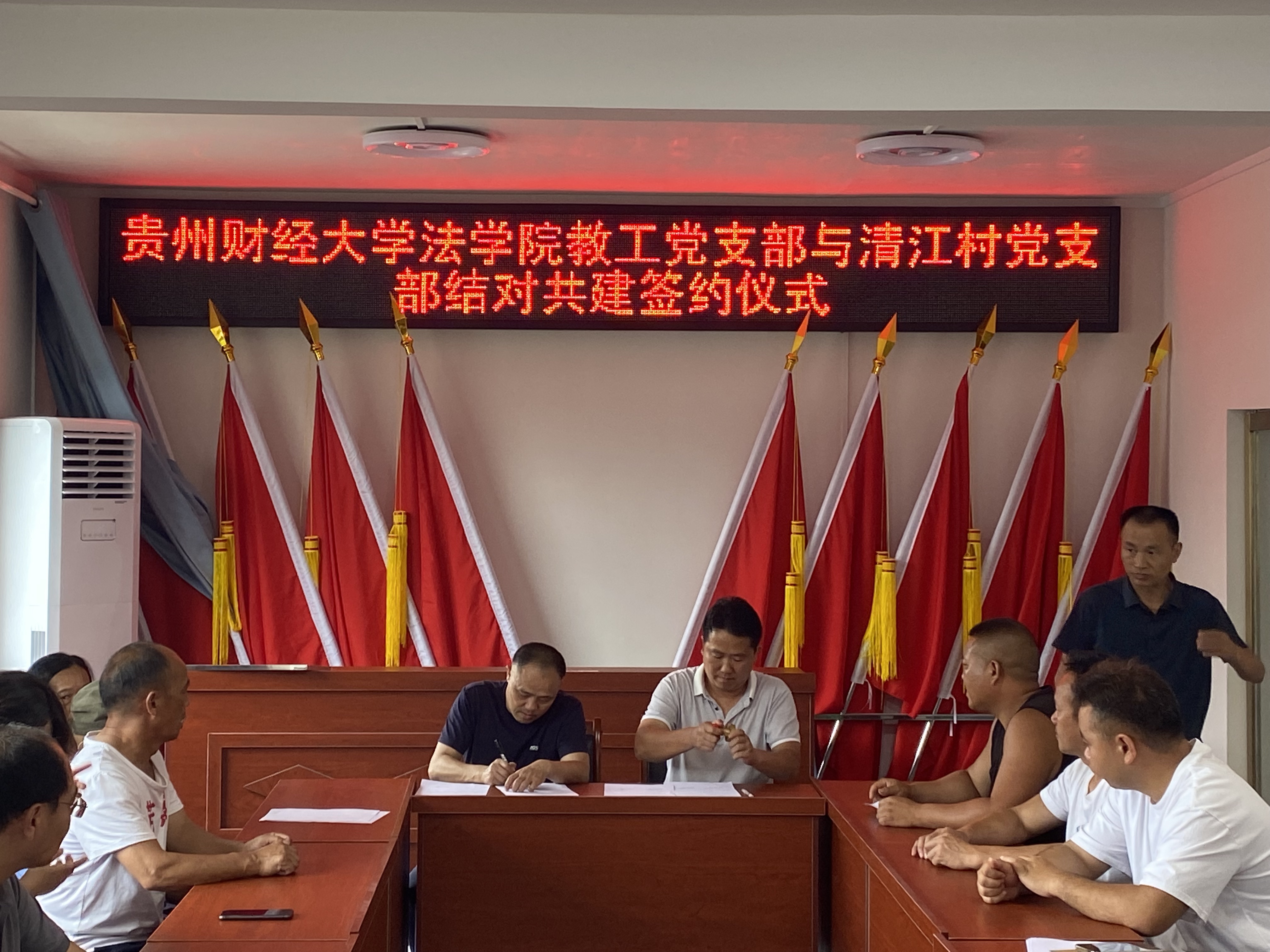 活动伊始,法学院党委与清江村村支两委、包括我院驻清江村第一书记李玉兰在内的驻村工作队开展座谈。清江村村支书陈世刚对法学院的到来表示欢迎,他介绍了清江村的村情民情等基本情况,希望法学院在民宿开发、苗族传统文化研学展销基地打造等方面给予支持。邵新顺表示将强化党建引领,与清江村党支部建立结对共建机制,发挥各自优势双向赋能,同时发挥法学院智力优势,为清江村的乡村振兴工作提供新思路、新方法。随后邵新顺与陈世刚共同为3377官方网页版党员法律志愿服务站挂牌。曹务坤和陈世刚则围绕村民比较关心的婚姻家庭问题开展了题为《守护家庭权益 助力乡村振兴》的理论宣传二人讲,并现场回答了村民的相关困惑。曹务坤作为法学院教工第二党支部书记与陈世刚签署了党支部结对共建协议,两个支部将在支部建设、产业发展、法律援助与调解等方面开展合作。