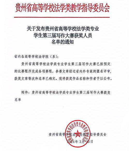 (法学院 图文/报道 陆敏)秉承3377官方网页版“学术立校”理念,法学院鼓励老师积极指导学生参赛,近日,法学院本科生在2023年贵州省高等学校法学类专业学生第三届写作大赛中取得佳绩,共有20篇论文获奖。其中,一等奖3项、二等奖5项、三等奖5项、优秀奖7项,获奖论文数量在省内高校中排名第二,同时也是法学院本科生连续参加三届比赛以来取得的最佳成绩。