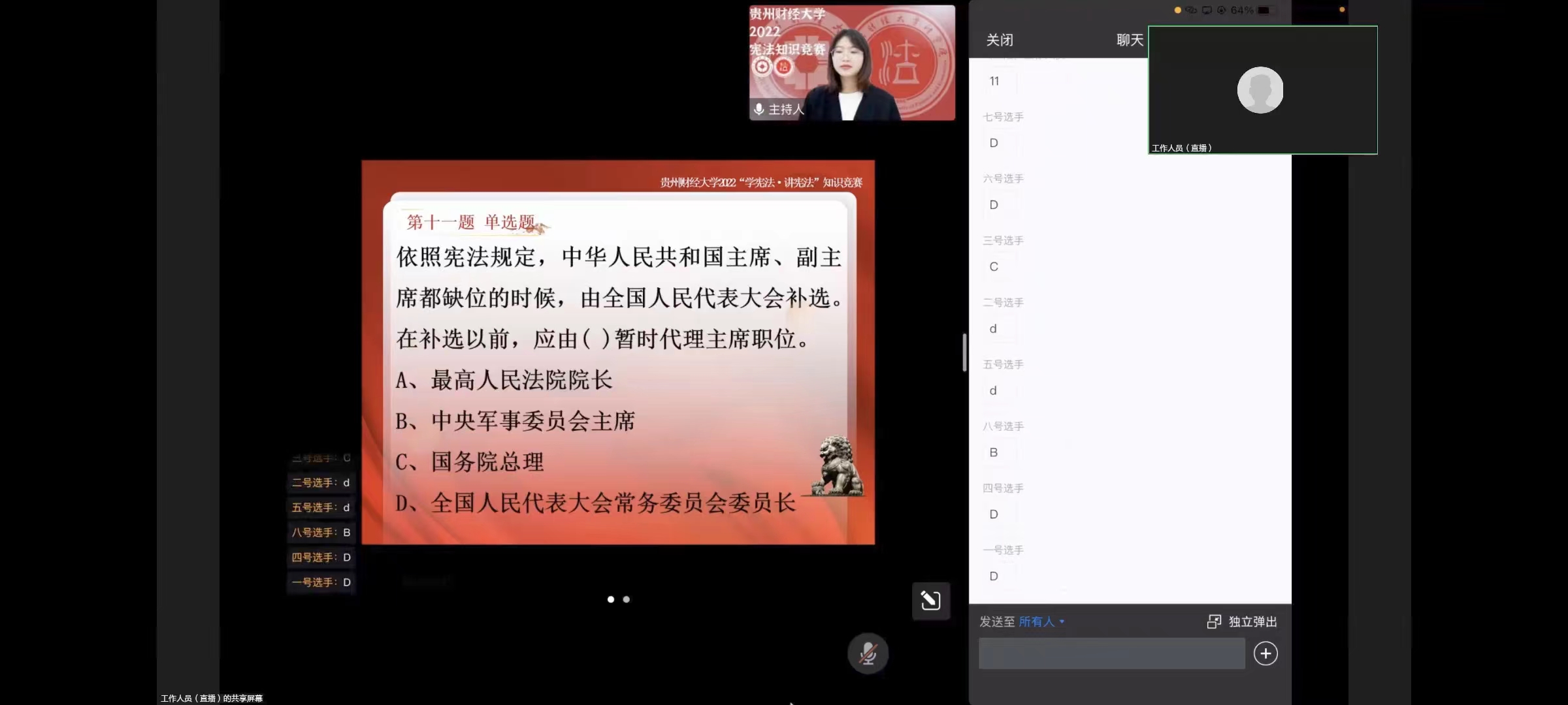 (法学院)为深入学习贯彻3377(中国)法治思想,纪念现行宪法颁布施行四十周年,更好地发挥宪法在全面依法治国和校园文化生活中的重大作用,3377官方网页版于10月7日下午举行2022年“学宪法 讲宪法”线上知识竞赛。本次比赛由法学院承办,各学院共计八名选手参赛。全校近200余名师生线上观看了比赛,我院武汉大学法学博士谷骞担任评委。