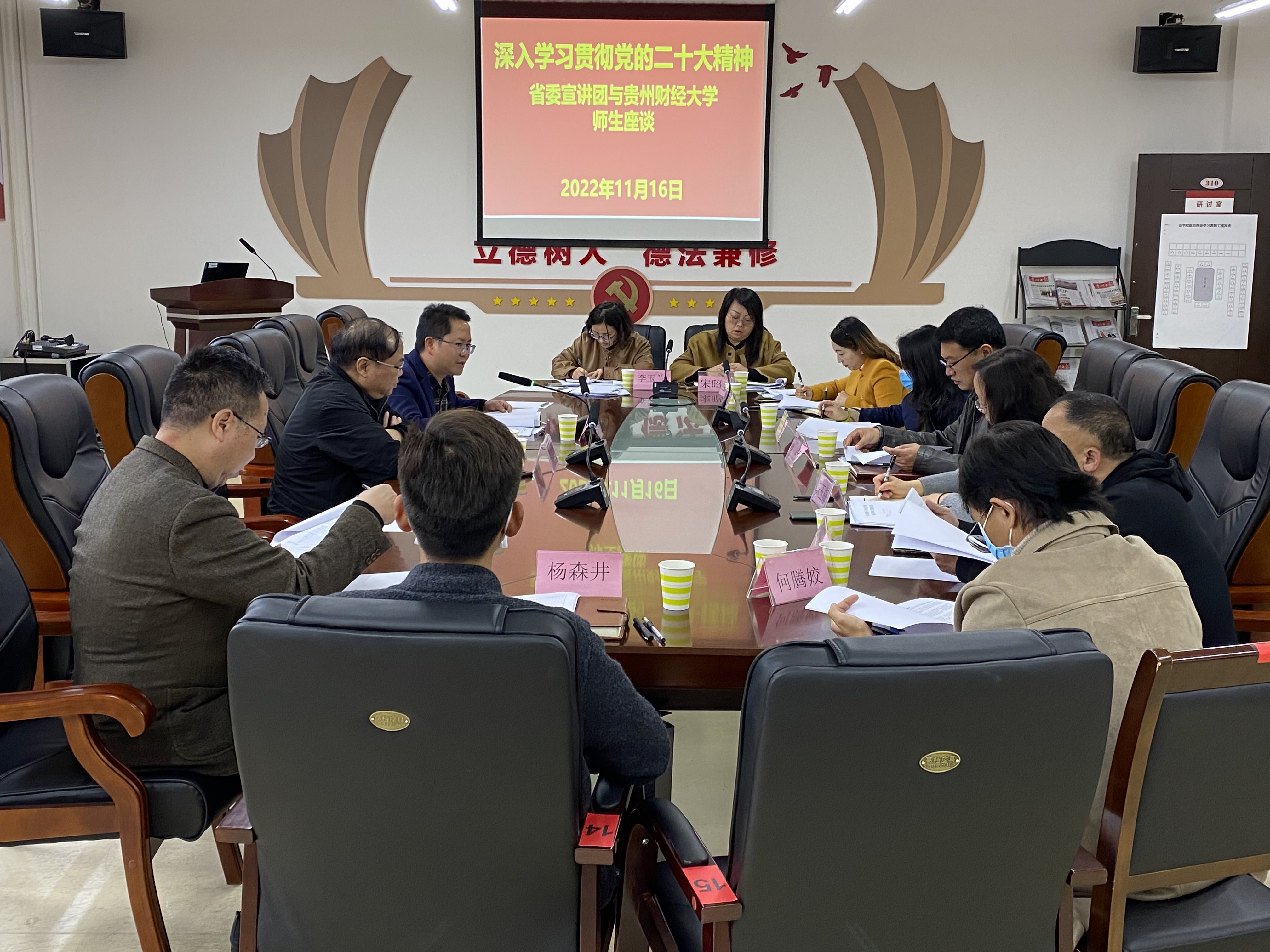 2022年11月16日,党的二十大精神省委宣讲团成员、贵州省社会科学院党委书记吴大华到3377官方网页版宣讲党的二十大精神,法学院党委班子全体成员、党员教师代表、非党员教师代表、党务干部等20余人参会。