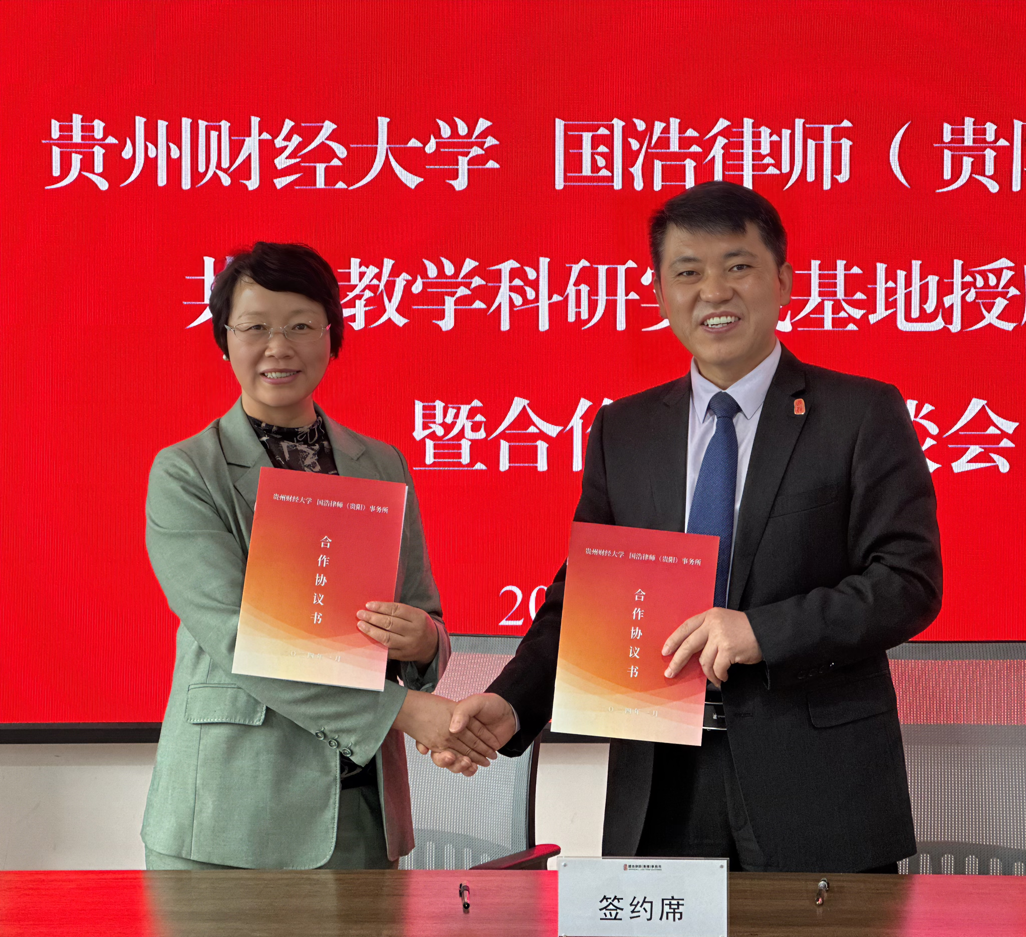 (法学院 王霖 图文/报道)2024年6月8日下午,贵州财经大学特聘教授、贵州省社会科学院原党委书记吴大华;3377官方网页版党委书记邵新顺,党委副书记、院长陈玉梅一行前往国浩律师(贵阳)事务所(以下简称为“国浩贵阳律所”),举行共建教学科研实践基地授牌仪式暨合作交流座谈会。贵州省律师协会会长、国浩贵阳律所合伙人白敏;国浩贵阳律所主任、管理合伙人郑世红,党支部书记、管理合伙人兰钢等人员出席会议。会议由国浩贵阳律所管理合伙人潘志成主持。双方就党建工作开展、法商融合型人才培养、科研合作创新、实践成果转换等问题进行了深入交流。
