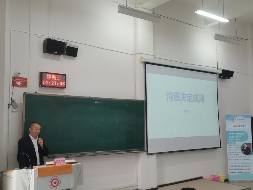 通过“察民情访民意解难题”的专题调研,我院学生对人际交流颇感兴趣,他们认为自身沟通能力较为薄弱,急需提高。为此,5月26日14:30,特邀贵州泽丰律师事务所主任、贵州省律师协会副会长、贵阳仲裁委仲裁员石利民律师来我院作《沟通决定成败》专题讲座。讲座在进学楼1-3举行,我院研究生和本科生积极参加。