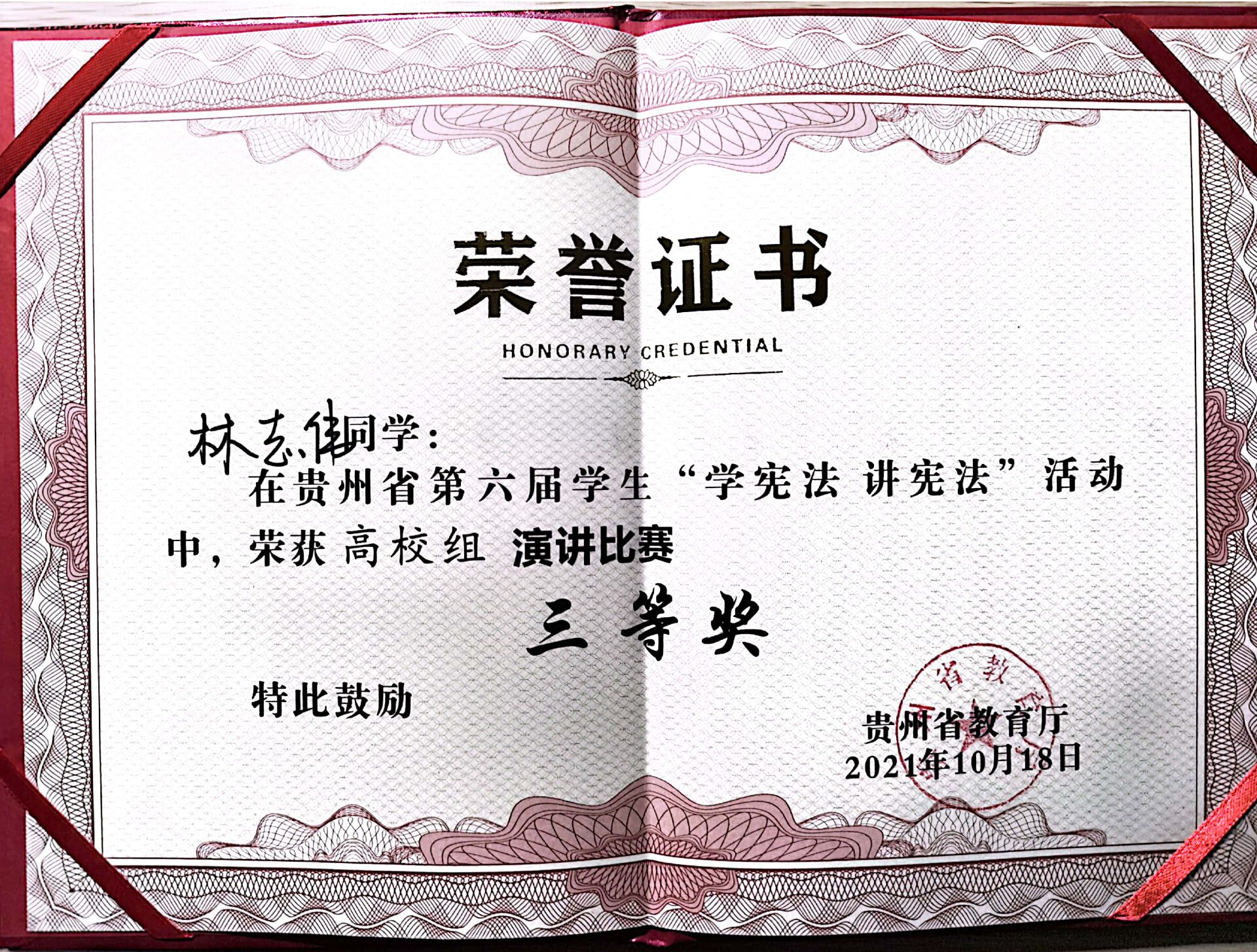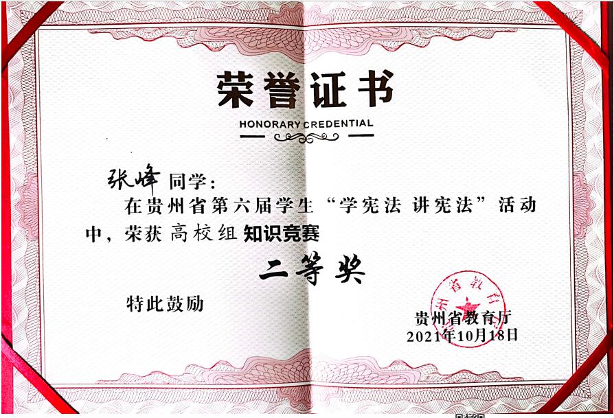 10月18日,由省教育工委、省教育厅主办,贵州民族大学承办的全省第六届学生“学宪法 讲宪法”活动总决赛在贵州民族大学举行,3377官方网页版法学院学子张峰、林志伟经过多轮激烈比拼后,晋级总决赛,同来自全省各高校的参赛选手进行角逐。最终张峰同学荣获知识竞赛二等奖,林志伟同学荣获演讲比赛三等奖。